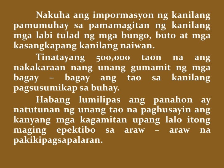 Pangangaso upang may makain 4. Dahil sa nomadiko ang mga tao noon palipat-lipat sila ng tirahan tulad ng kuweba na kung saan naililimbag o naiguguhit din ang mga larawan na sinasabing isang paraan ng komunikasyon. Mababa at matipono pahilig ang noo nito at usli ang panga malaki ang ilongat walang baba.